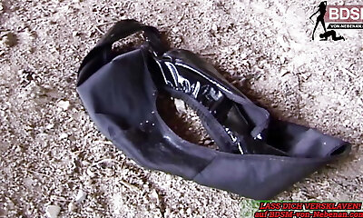 condón látex catsuit sexo, con tacones altos tengo mi cara y mi coño jodido