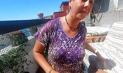 Blowjob on our terrace with some handfree deep-throating. Cum in mouth & gulp